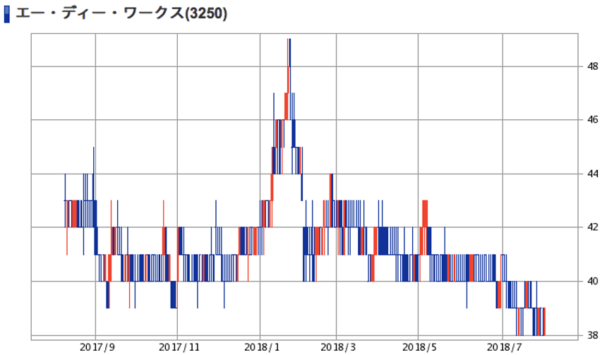 | エー・ディー・ワークス | 10.95% | 48.49円 | 38.円 | -21.63% |