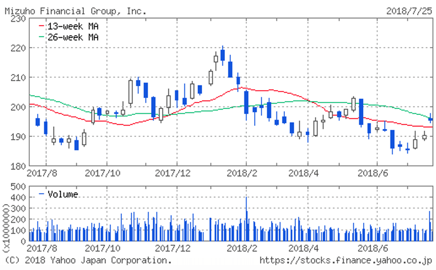 | (8411)みずほフィナンシャルグループ | 株価 (2018/7/25 終値) | 195.4円 |
