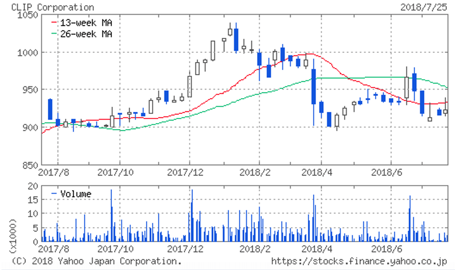 | (4705)クリップコーポレーション | 株価 (2018/7/25 終値) | 923円 |